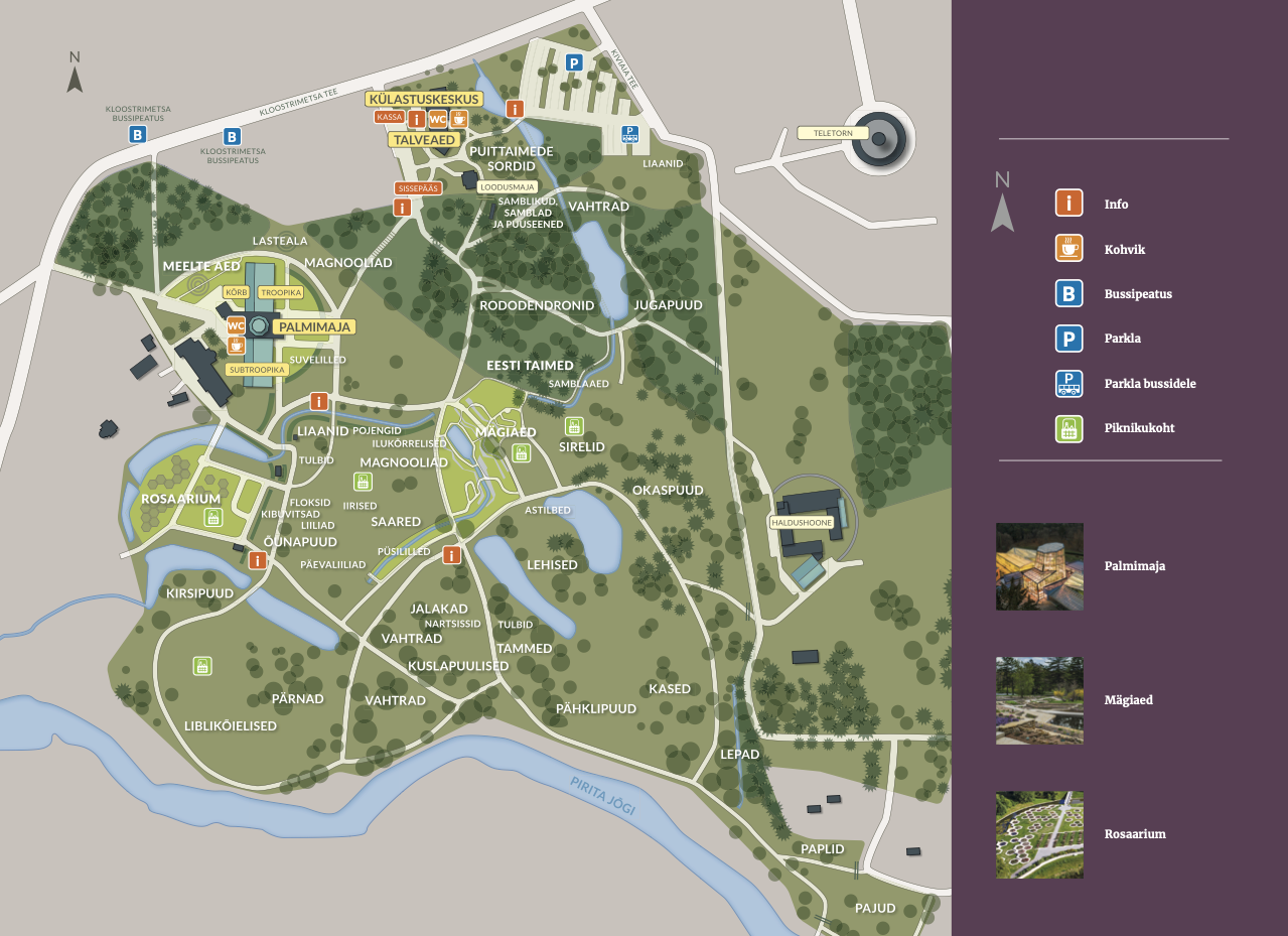 Palmimaja ja kasvuhooned 11-16, külastuskeskus 10-16, avamaa 9-20, territoorium suletakse iga päev 21.00