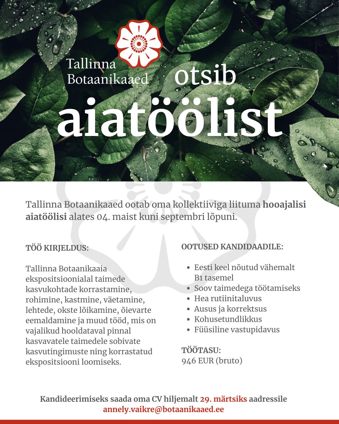 Kandideerimiseks saada oma CV hiljemalt 29. märtsiks aadressile annely.vaikre@botaanikaaed.ee